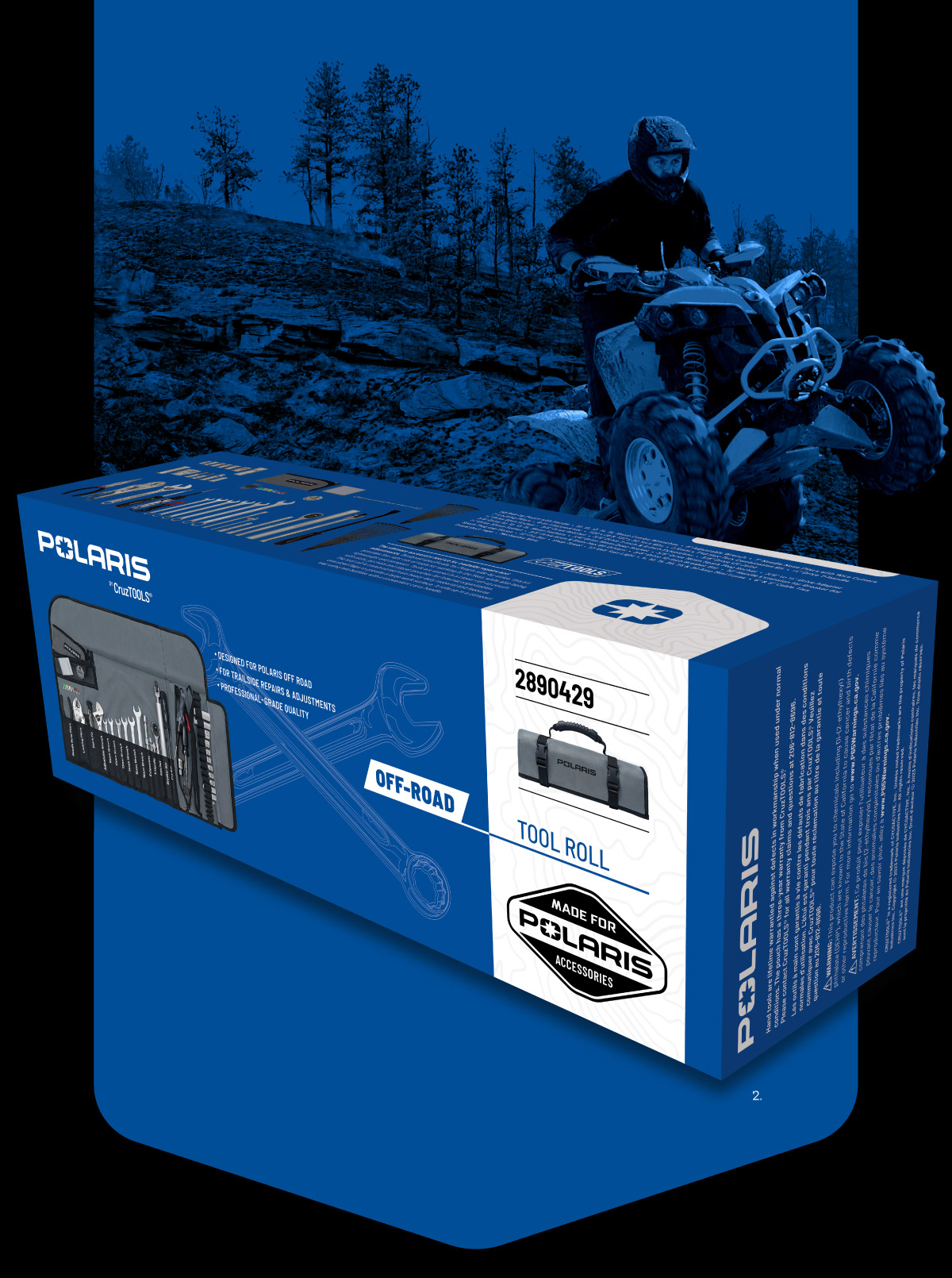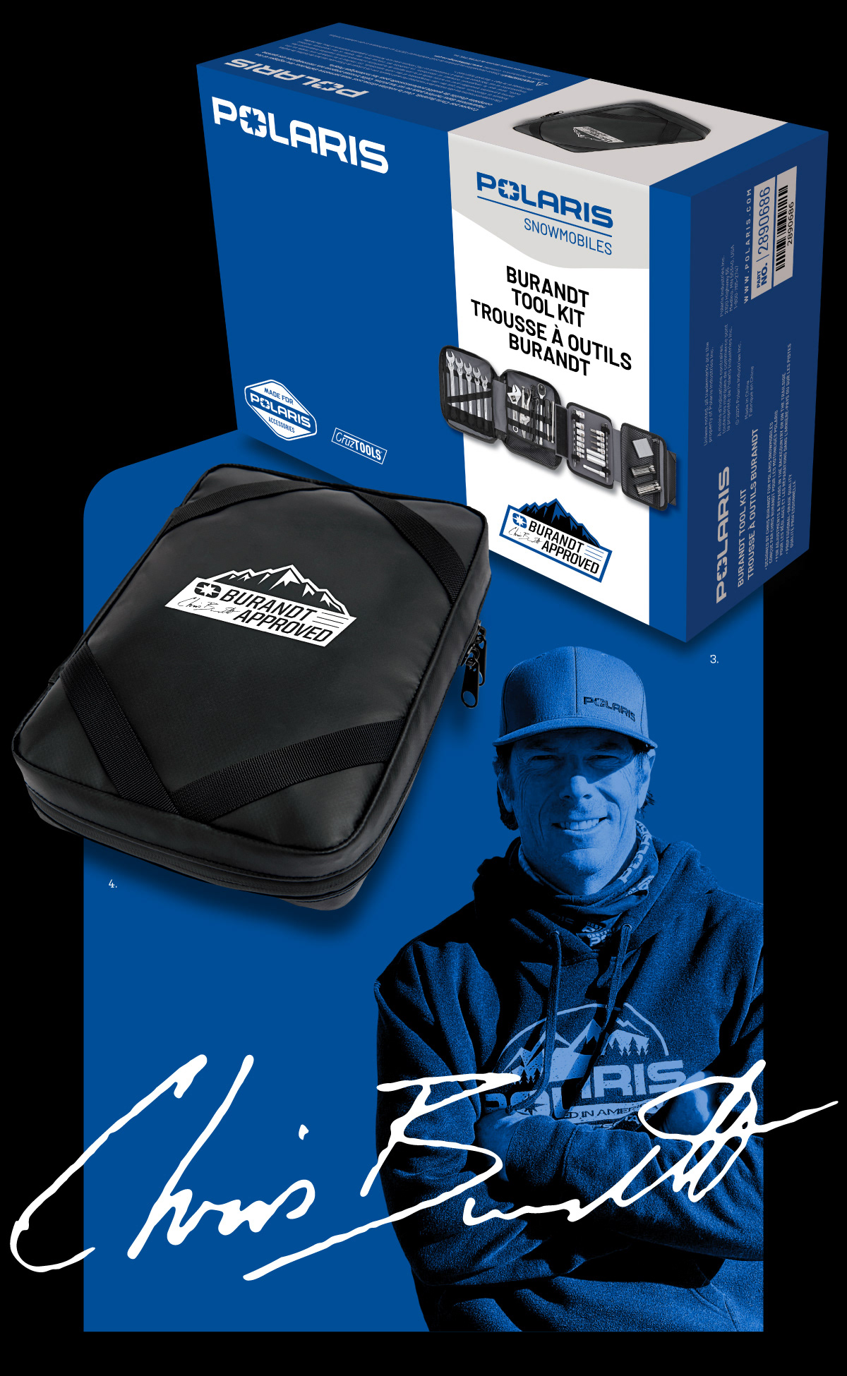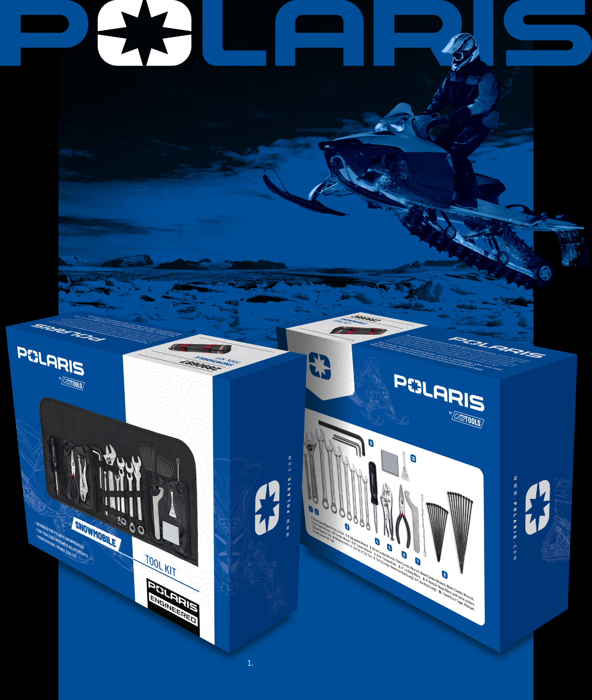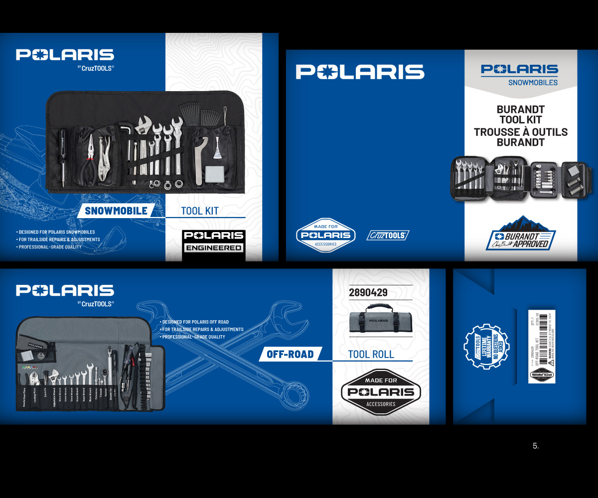 1: Snowmobile Toolkit Packaging Execution. 2: Off-Road Toolkit Packaging Execution. 3: Chris Burandt 'Approved' Snowmobile Toolkit Packaging Execution. 4: Snowmobile Toolkit Pouch Branding. 5: Packaging Execution System Overview.
