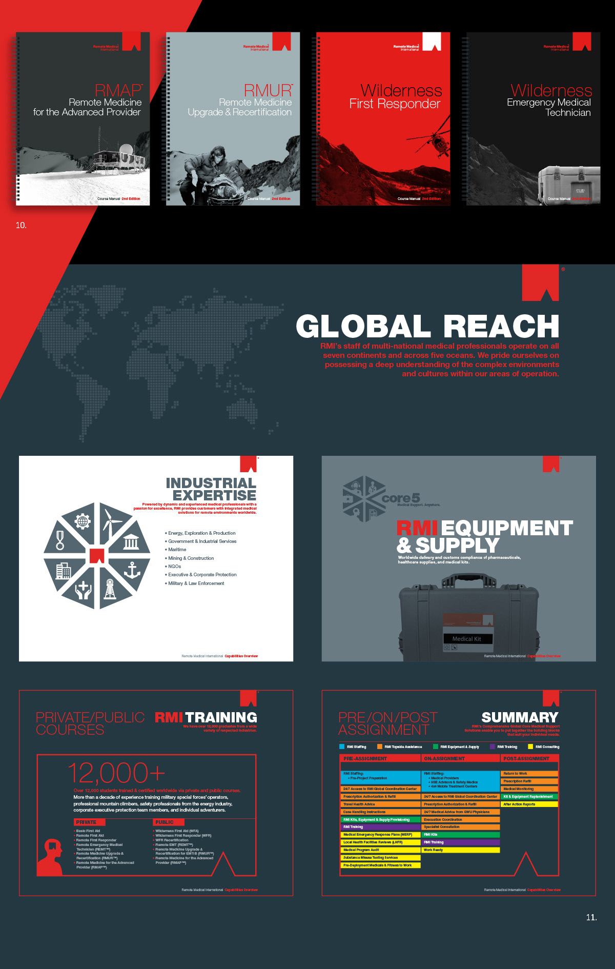 1: RMI Brand Logo Design. 2: Equipment Catalog Design. 3: Branded Custom Medical Kits. 4: Logo Studies For RMI Brand. 5: Apparel & Accessory Branding. 6: Core Five Logo Design. 7: Product Sell-Sheet Design. 8: Tradeshow Branding. 9: Vehicle Branding Design. 10: Medical Course Manual Design. 11: Company Capabilities Presentation.