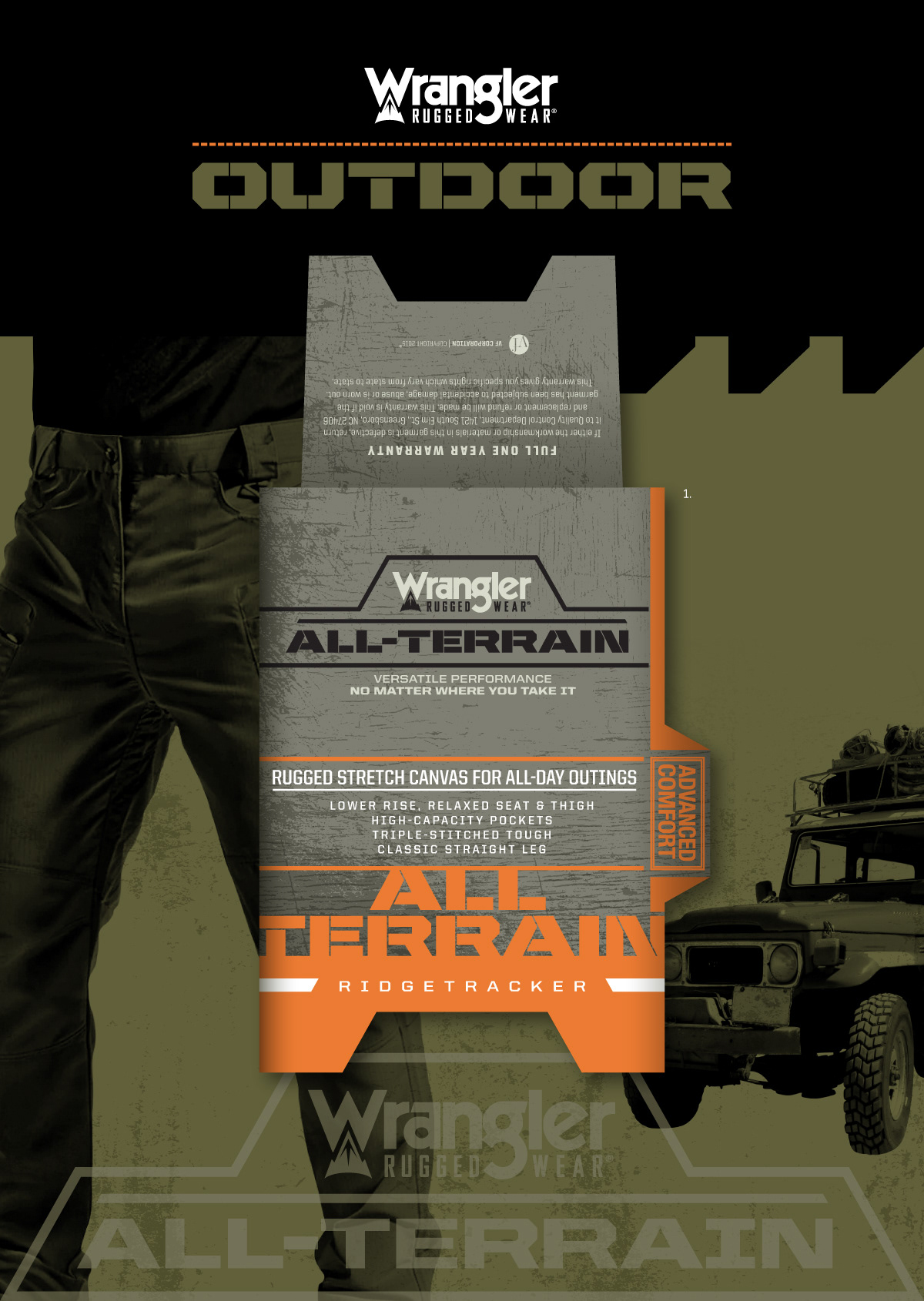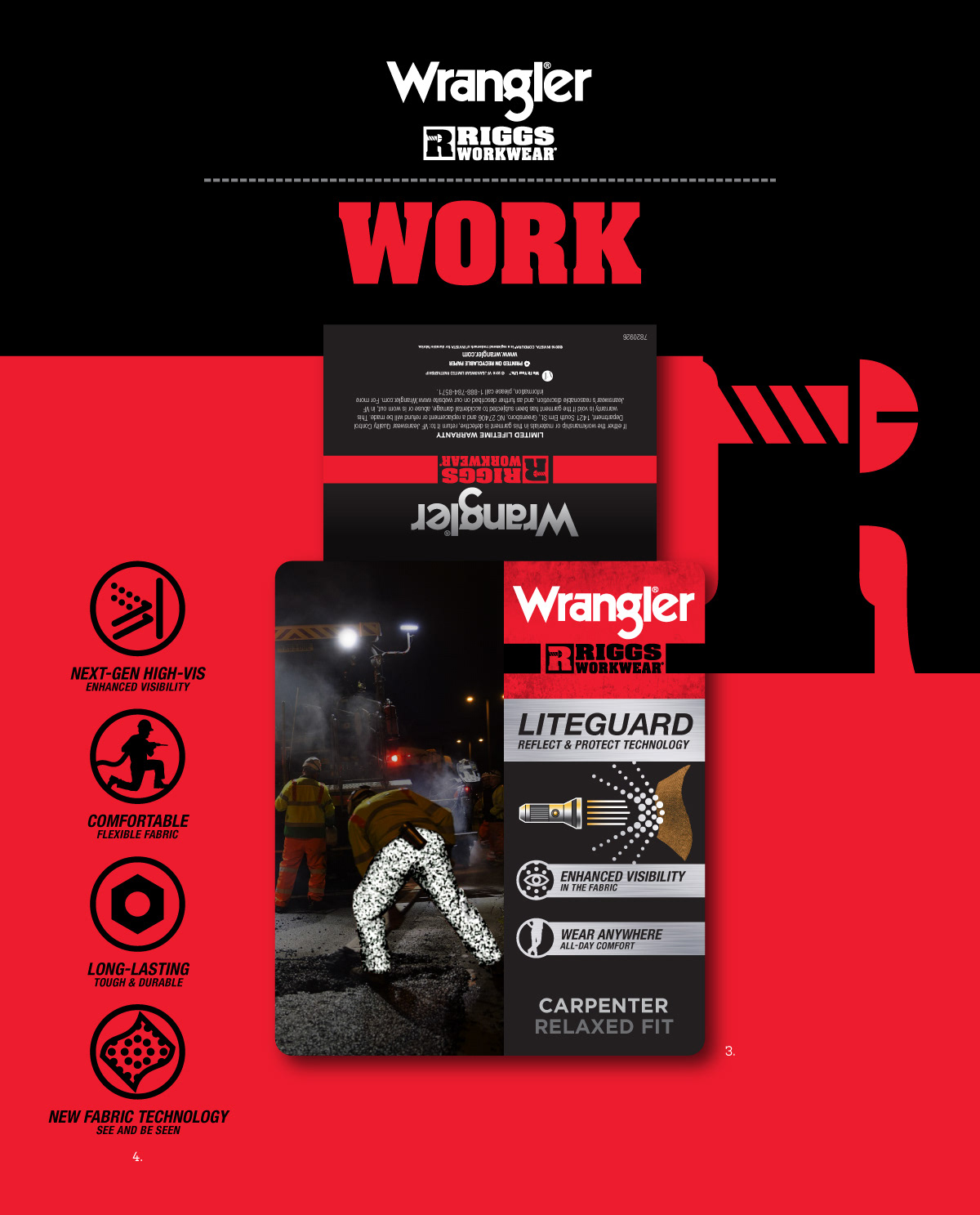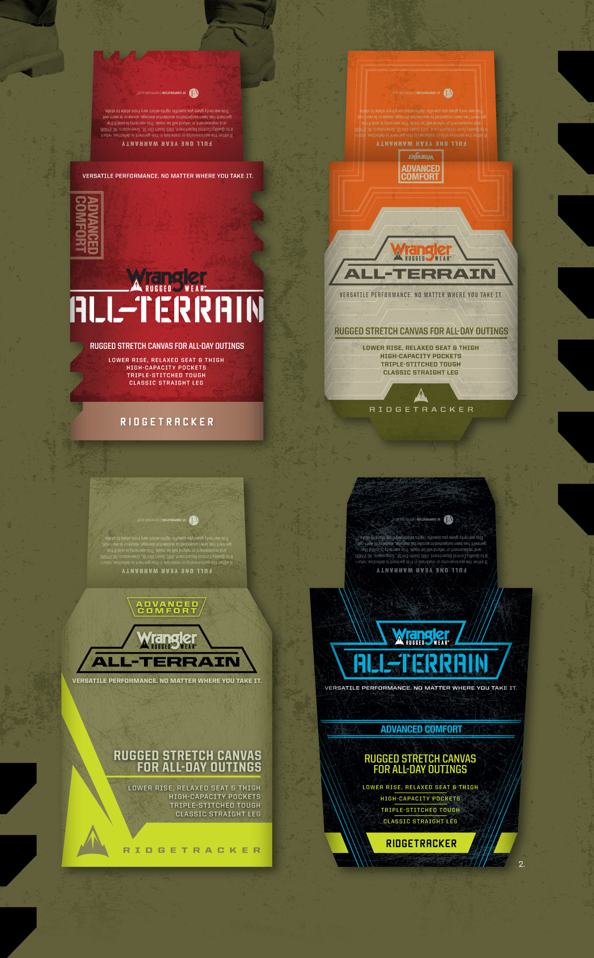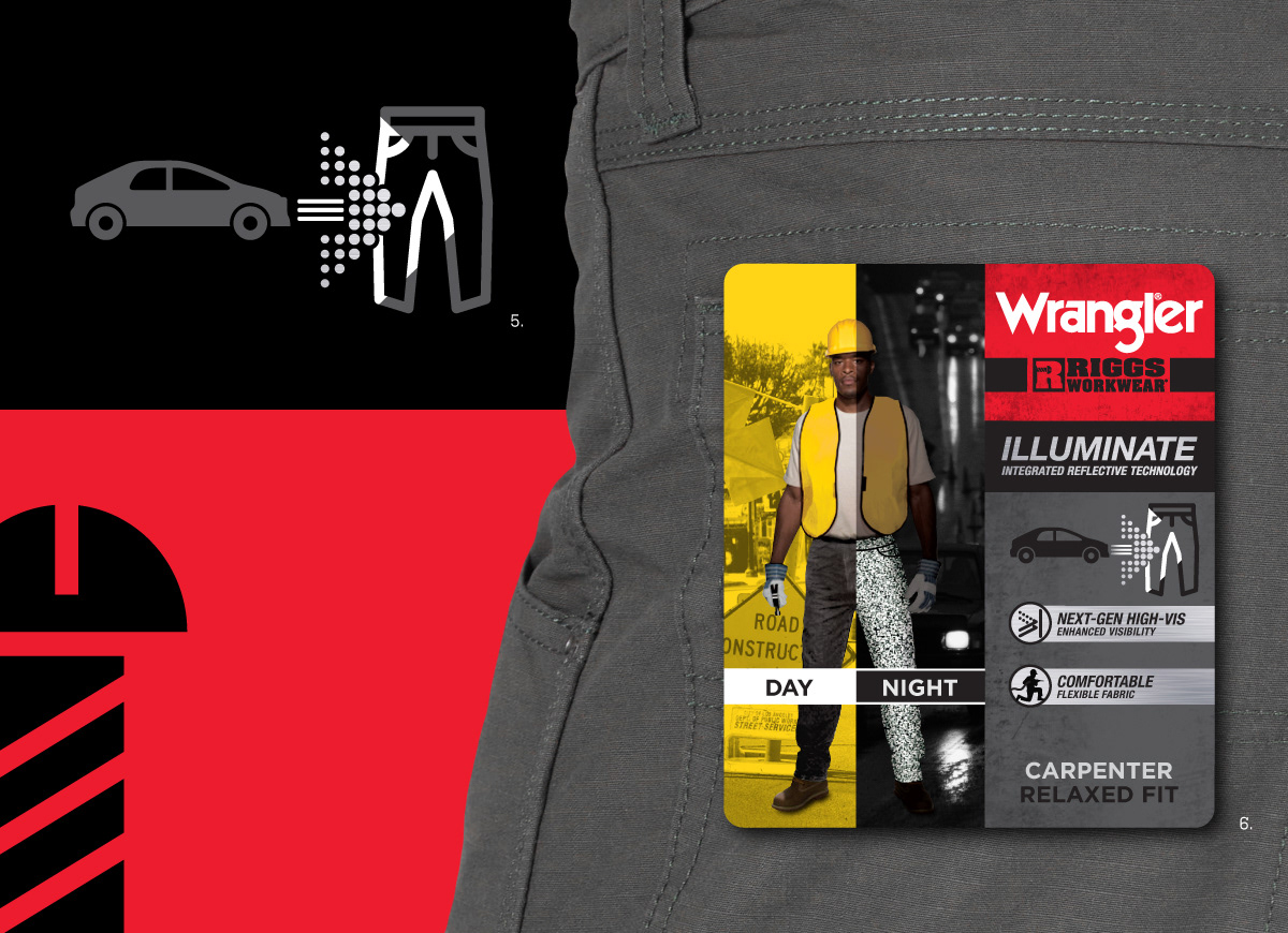 1: All-Terrain—Pants Billboard Card Graphic. 2: All-Terrain—Pants Billboard Card Graphic Design Concepts. 3: LiteGuard—Work Pants Billboard Card Graphic. 4: LiteGuard/Illuminate—Product Features Icons. 5: LiteGuard/Illuminate—Main Product Feature Icon. 6: Illuminate—Work Pants Billboard Card Graphic. 7: Heritage Collection—Mens & Womens Pants Hangtag Graphics. 8: Heritage Collection—Jeans Fabric Inner Tags & Pocket Badging.